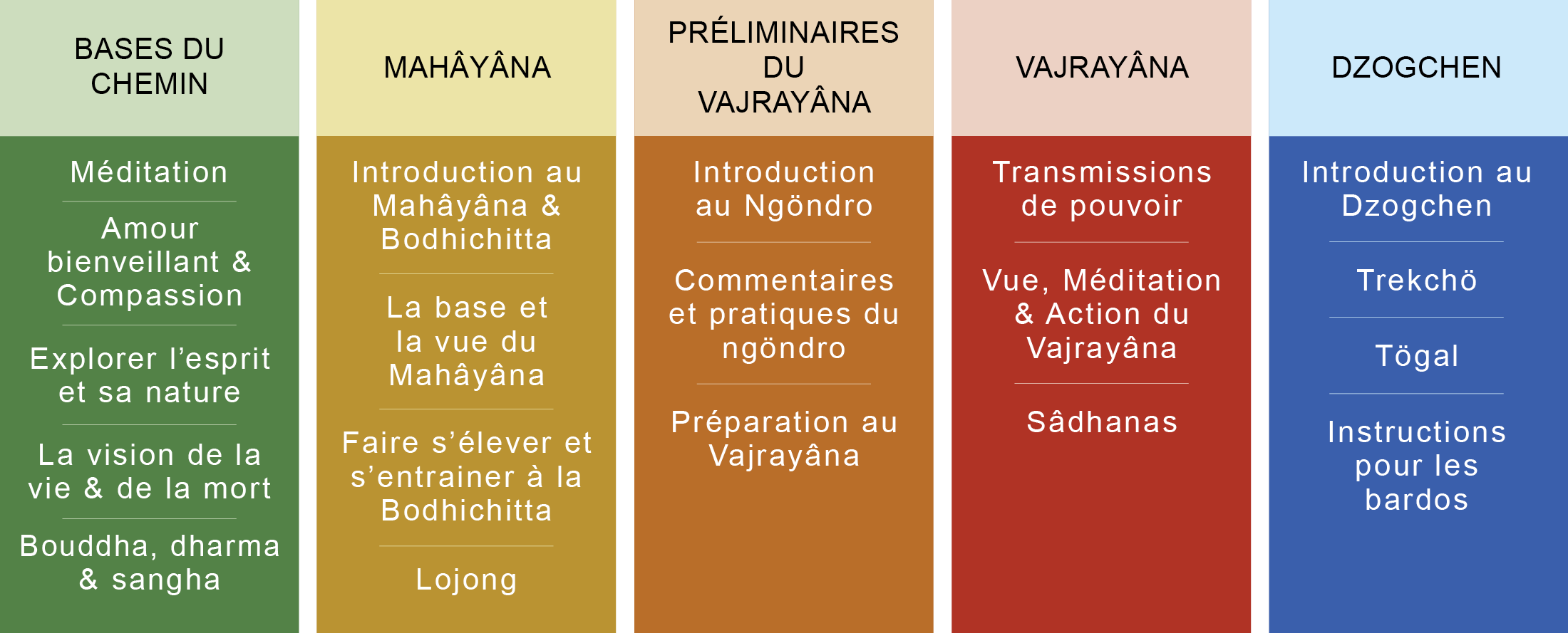 Dans les grandes lignes, le curriculum de Rigpa est divisé en cinq catégories ou cinq étapes :